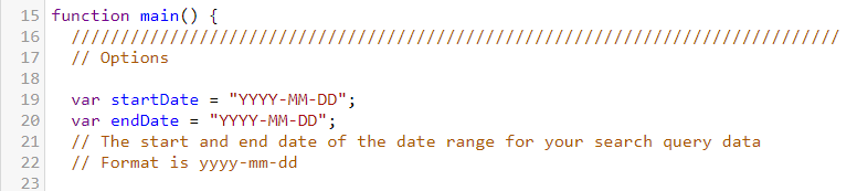 The first thing we want to do is change the start date and the end date for our data analysis. The script does not have a default time frame, so you will need to input your own.