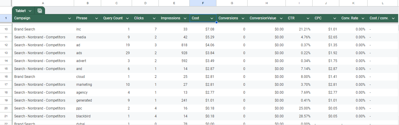 Lastly, after deleting those rows,you need to turn each sheet of data into a table with headers. This allows you to sort through the data and find wasted ad spend easily.