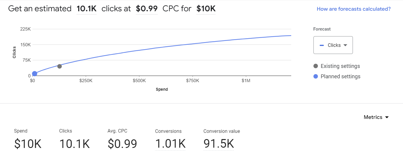 In the keyword research section below, you’ll be able to determine what your average click costs will look like.
