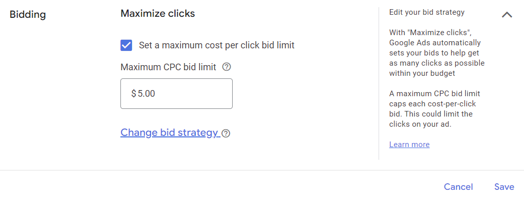 The second most important element behind budget is your bidding. You want to make sure you’re doing maximize clicks, and you want to make sure that your max CPC is set. Paying $100 for a click because Google thinks it is worth that much because you didn’t set a max CPC is never a happy experience.