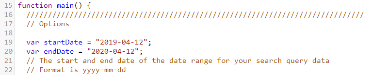 The first thing we want to do is change the start date and the end date for our data analysis. The script does not have a default time frame, so you will need to input your own.