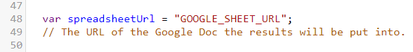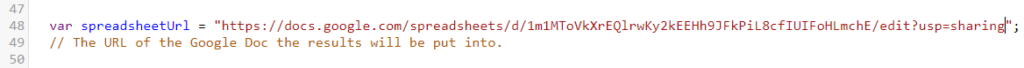 The only other change you need to make is to add your Google sheet URL so your data is sent to a URL. Let’s scroll down to line 48 in the code–you will see the code line to the left–and we’ll see the input for the variable.