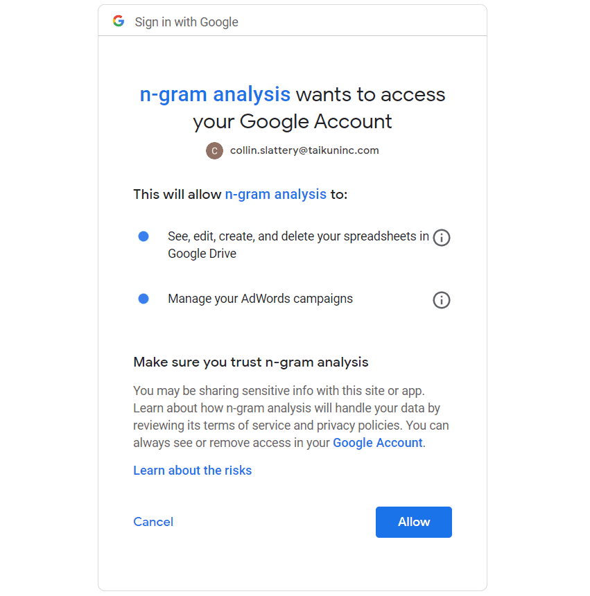 If you do not see both spreadsheets in Google Drive AND manage Google Adwords campaigns, that means you will need to do one more step. In either case, click allow.