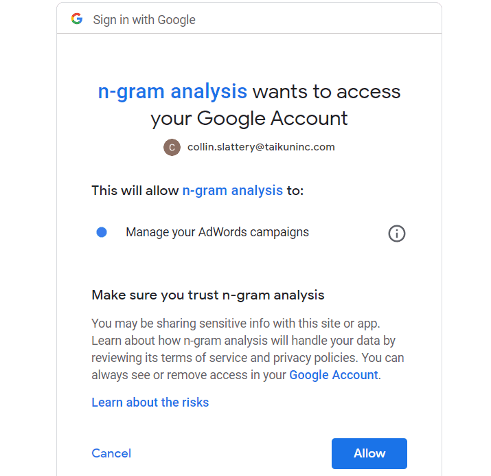On the next screen you will see Google telling you what the script is trying to access like in the screenshot below.