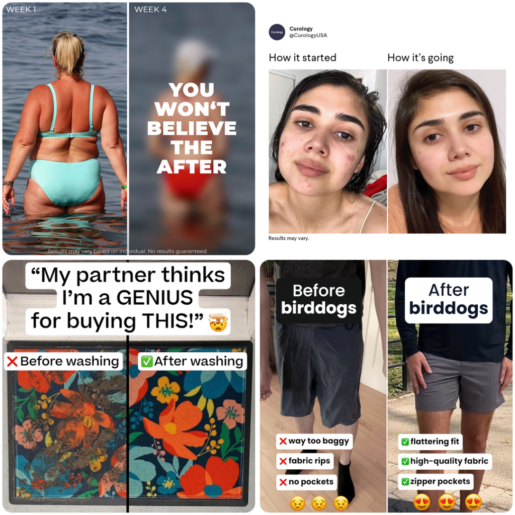 Doing Before/After can be tricky in Facebook ads. Depending on the niche you’re in it can be a struggle to get them approved [especially if you’re in the weight loss niche], however there are ways to label the results so you can avoid getting your creatives rejected by the platform – see these examples below: