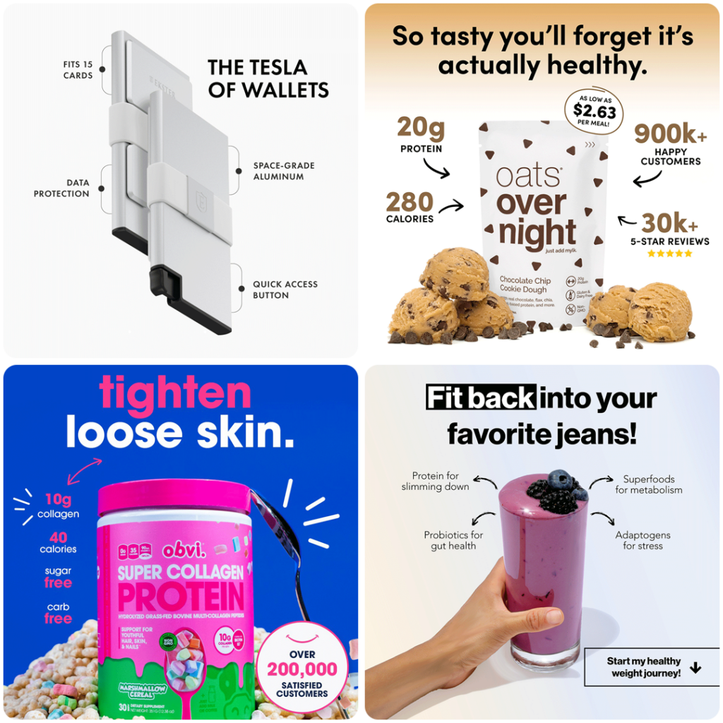 The Feature/Benefit Callout Ad is a great option for all industries and super easy to test, doesn’t require many assets to create, and you can use product photography or even a UGC shot.