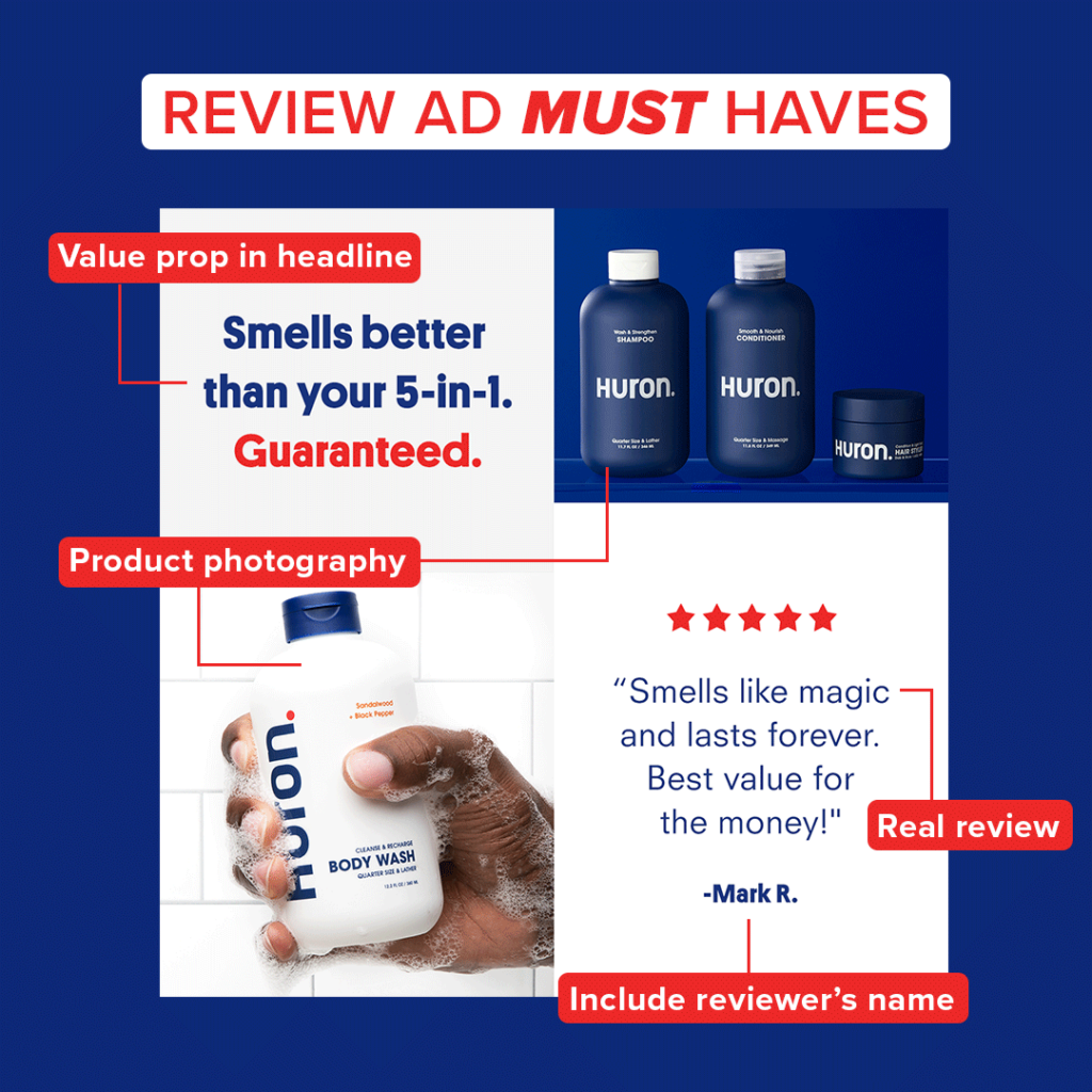 - It can be done in a variety of formats: a static image of your product and the review overlayed on it, make a GIF with several reviews or a video showing your product and start adding reviews with animated text, screenshots from your website, or even VO.