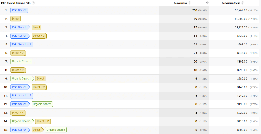To give you an idea of the different click journeys to conversion that exist, here is a screenshot from one client account of just the 15 most common conversion journeys for the past month.