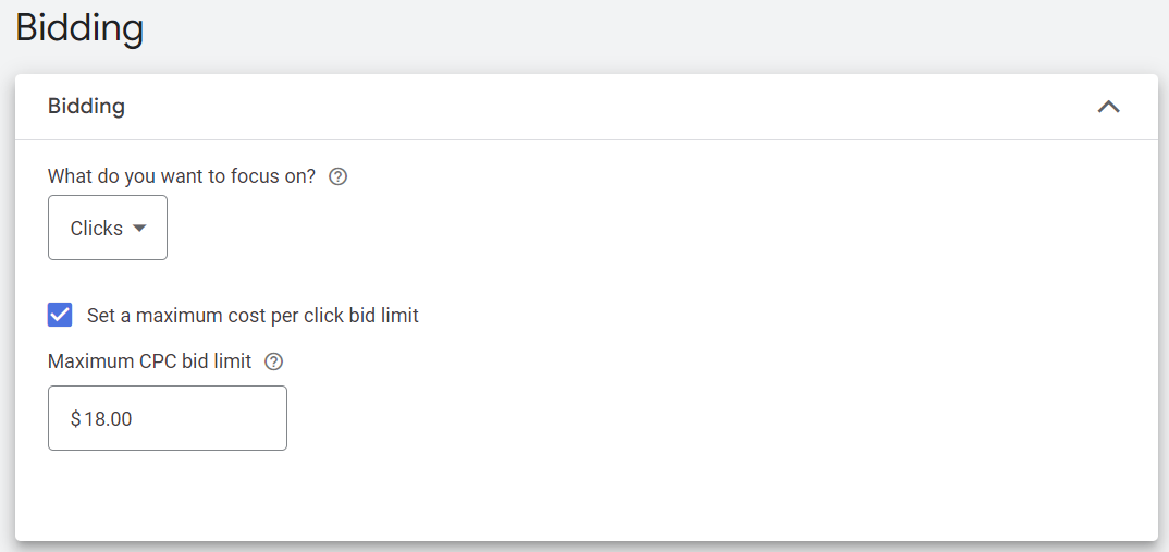 The second most important element behind budget is your bidding. You want to make sure you’re doing maximize clicks, and you want to make sure that your max CPC is set. Paying $100 for a click because Google thinks it is worth that much because you didn’t set a max CPC is never a happy experience.