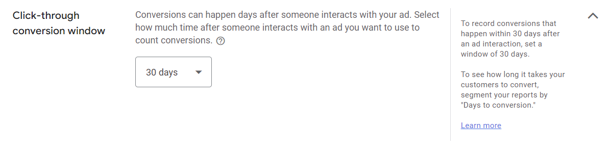The default conversion window is 30 days, and I recommend leaving this as is. Making changes to this is not a setting you need to tweak early on.