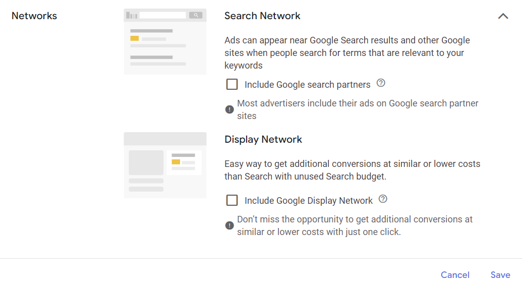 You want to make sure that this setting is for the search network and that search partners and the display network are both disabled.