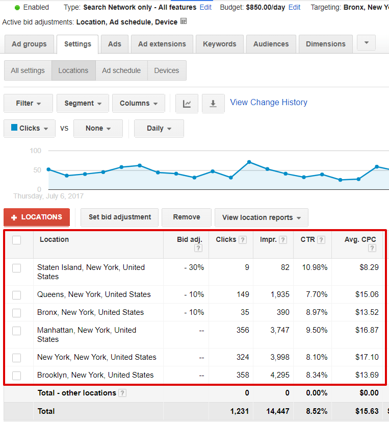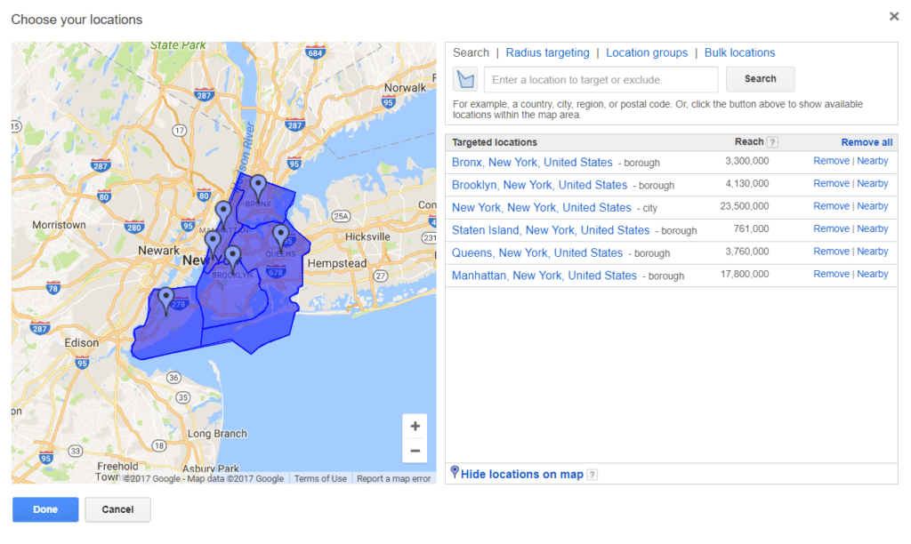 And when you layer multiple location targeting options you can refine what you want to do. Let’s say you run a moving company in Brooklyn, New York. Your most likely customers live in Brooklyn, but many live in the other boroughs in New York City. For your ad campaign, you can target each individual borough, and then make bid adjustments on the boroughs that are less likely to bring business like The Bronx or Staten Island. This allows you to spend the most targeting your most likely customer while still reaching good potential customers for less money. You can see what this looks like in the image to the right. This can also be accomplished in areas without the same degree of granularity that New York City has. You can use the radius targeting option to achieve the same effect. You can set up multiple target radii–Let’s say 25 miles and 10 miles–and have a positive bid adjustment for the 10 mile targeting radius, which means you’re willing to spend more per click for those clicks than you are on clicks from 25 miles out.